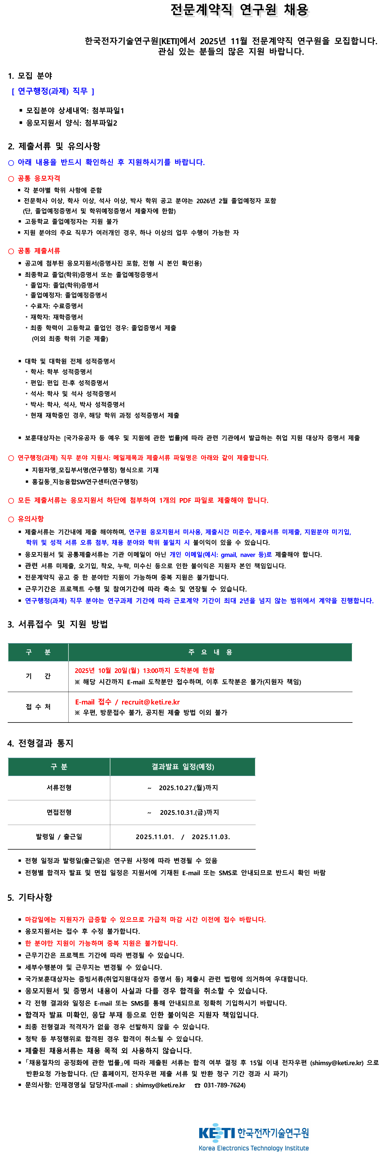 [첨부1]2025년 11월 연구행정(과제) 모집분야.pdf (51.71 Kb / Down : 270) [첨부2]★KETI응모지원서.hwp (213.00 Kb / Down : 83)
