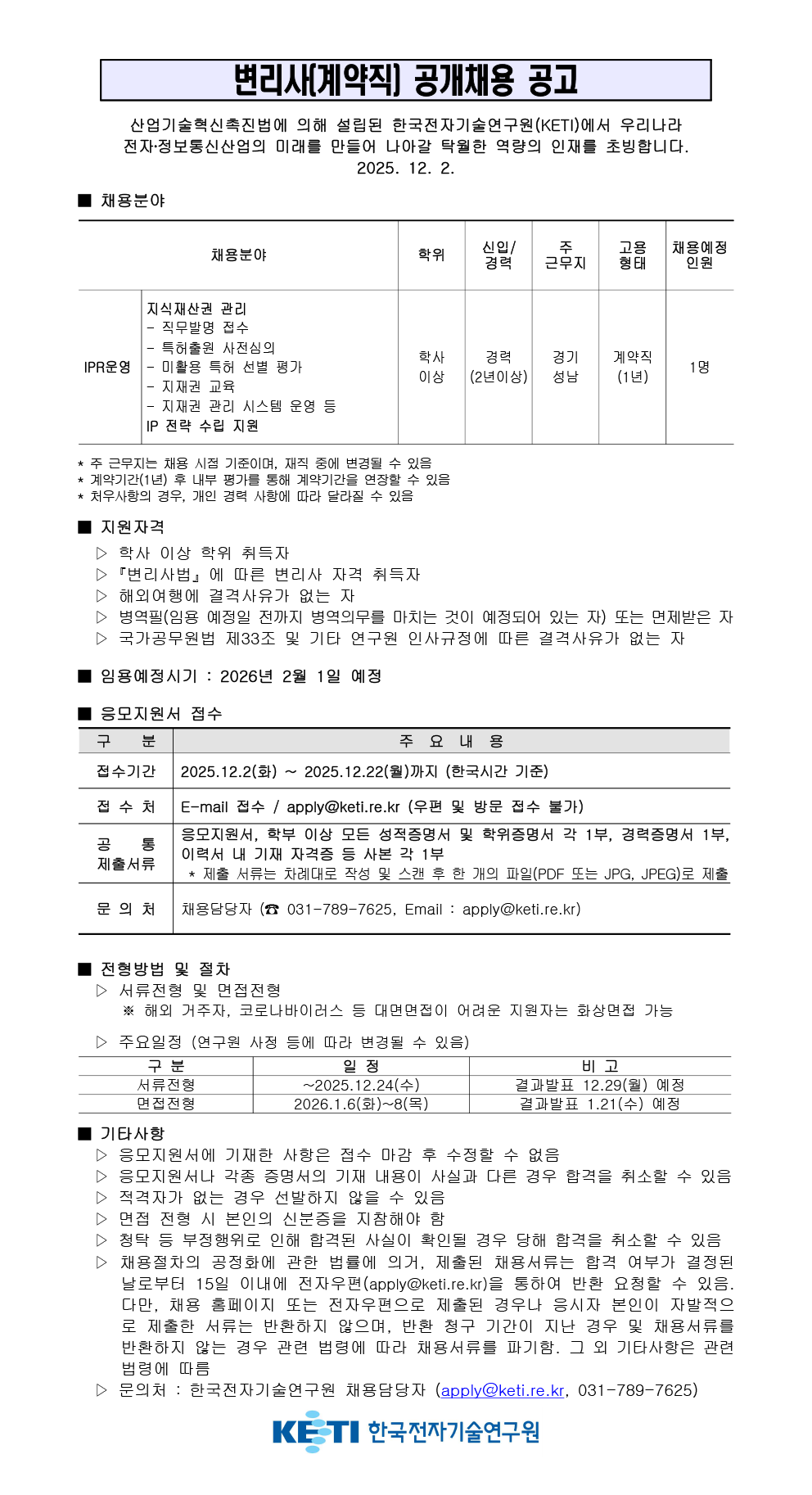 [공고] 2025년 변리사(계약직) 공개채용.pdf (65.19 Kb / Down : 31) [양식] 응모지원서.hwp (58.50 Kb / Down : 31)