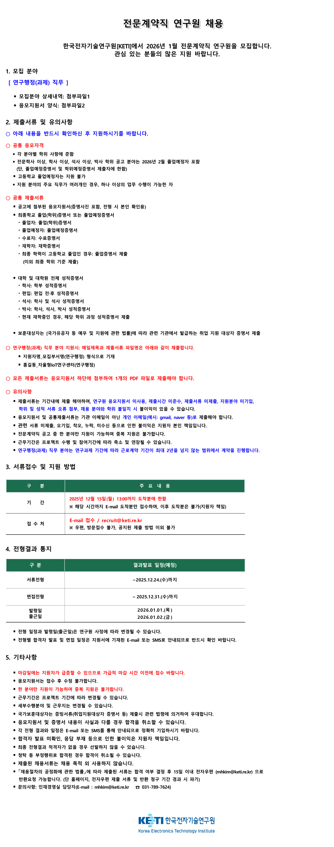 [첨부2] KETI응모지원서.hwp (213.00 Kb / Down : 71) [첨부1] 2026년 1월 연구행정(과제) 채용공고_모집분야_연구행정.pdf (31.57 Kb / Down : 95)