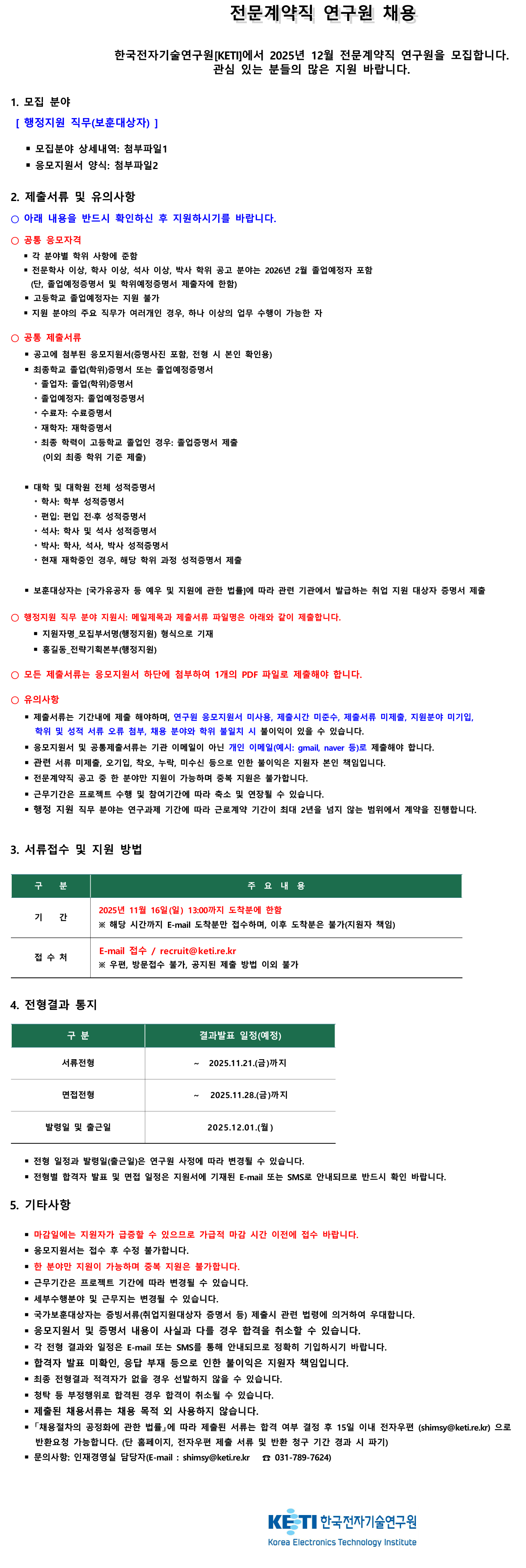 [첨부1]2025년 12월 행정지원 모집분야(보훈대상자).pdf (37.42 Kb / Down : 56) [첨부2]★KETI응모지원서.hwp (213.00 Kb / Down : 30)