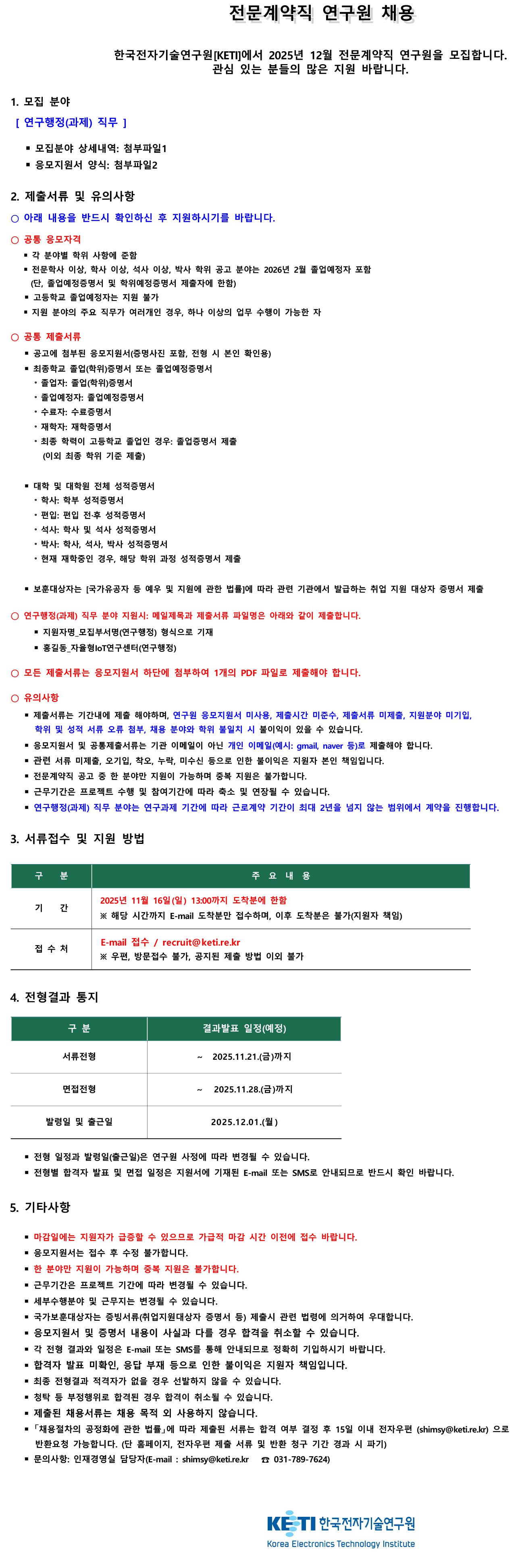 [첨부1]2025년 12월 연구행정(과제) 모집분야.pdf (40.07 Kb / Down : 287) [첨부2]★KETI응모지원서.hwp (213.00 Kb / Down : 84)