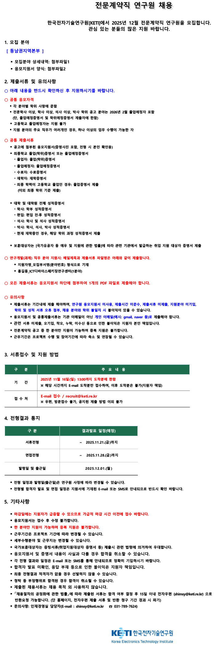 [첨부1]2025년 12월 동남권지역본부 모집분야.pdf (38.34 Kb / Down : 285) [첨부2]★KETI응모지원서.hwp (213.00 Kb / Down : 91)