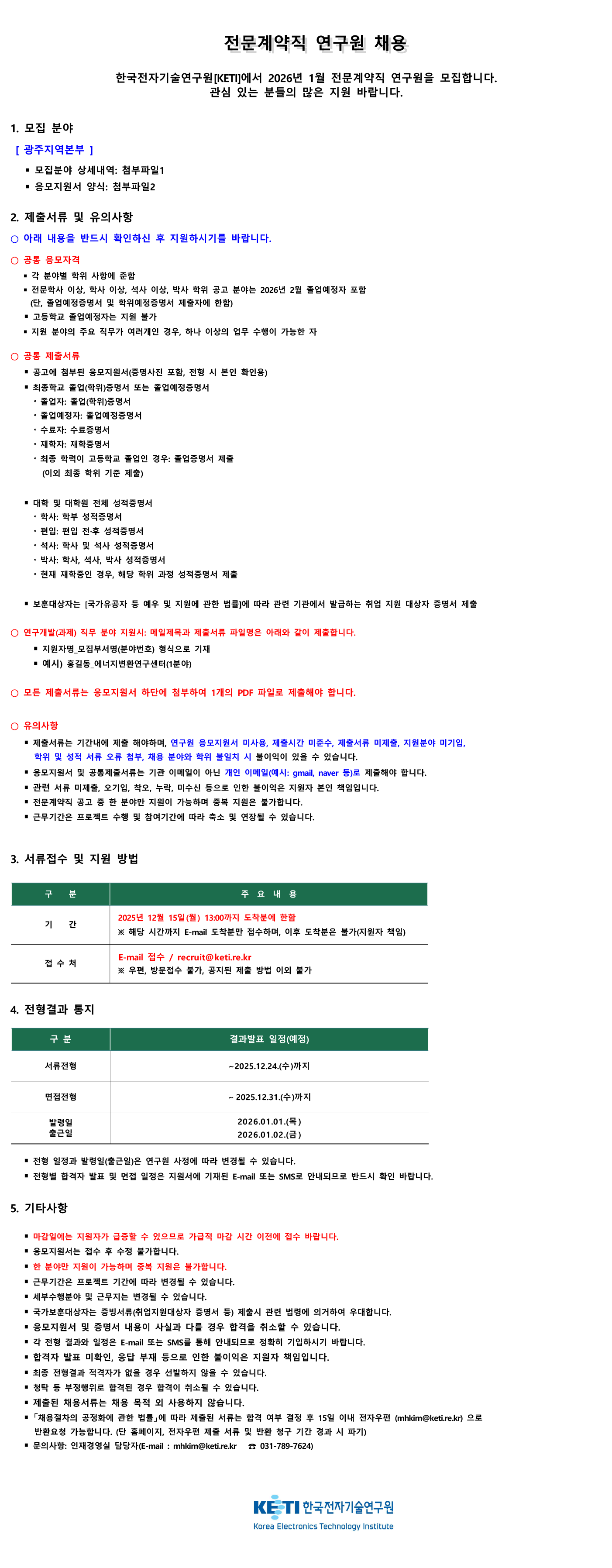 [첨부2] KETI응모지원서.hwp (213.00 Kb / Down : 58) [첨부1] 2026년 1월 광주지역본부 채용공고_모집분야.pdf (43.34 Kb / Down : 90)