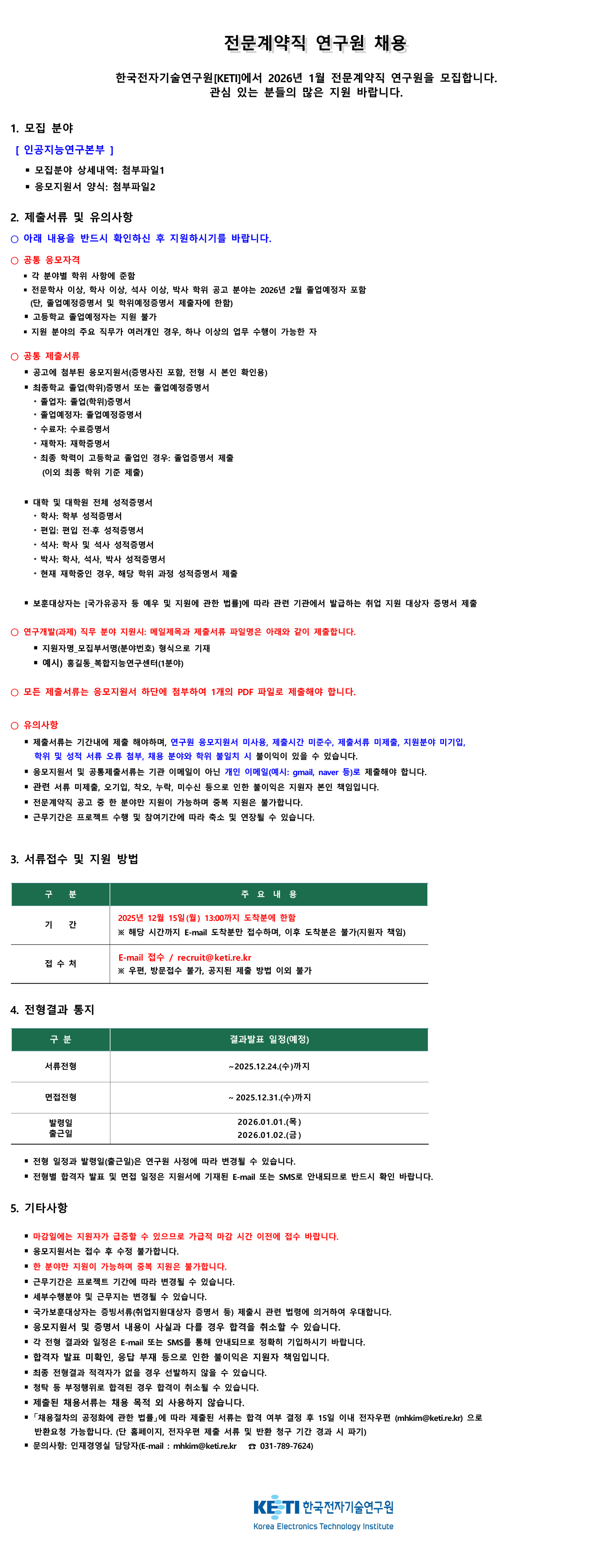 [첨부2] KETI응모지원서.hwp (213.00 Kb / Down : 111) [첨부1] 2026년 1월 인공지능연구본부 채용공고_모집분야.pdf (59.11 Kb / Down : 140)