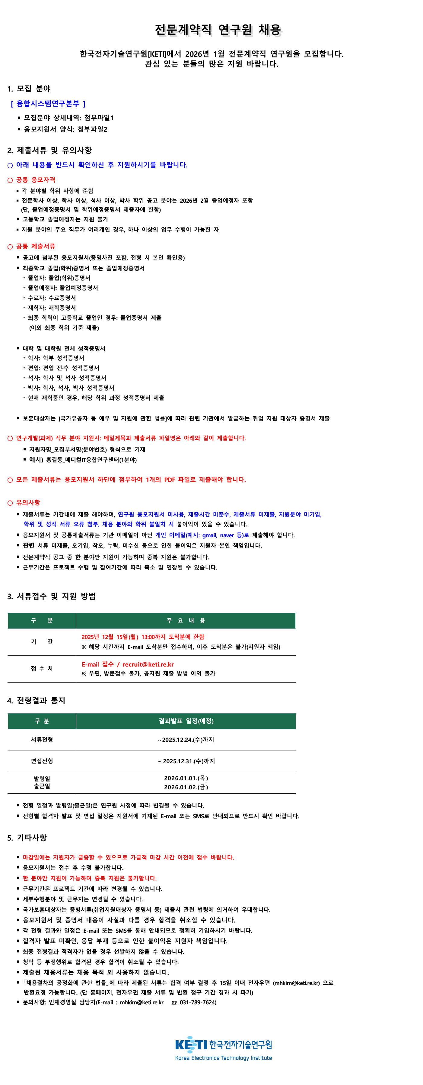 [첨부2] KETI응모지원서.hwp (213.00 Kb / Down : 106) [첨부1] 2026년 1월 융합시스템연구본부 채용공고_모집분야.pdf (69.88 Kb / Down : 177)