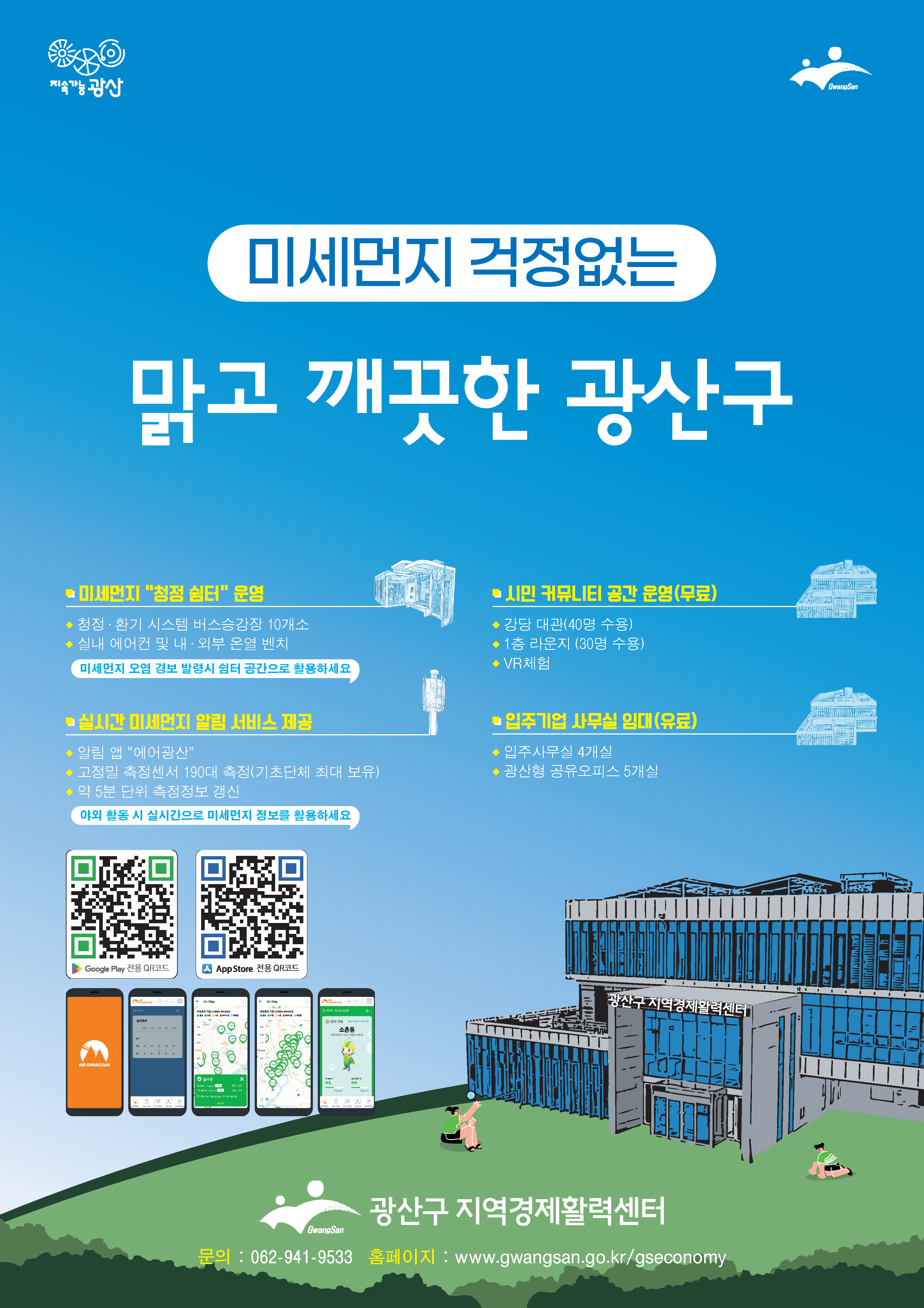 지역 시민들을 위한 대기질 관련 공공정책 수립 및 공기 산업 활성화를 목표로, 광주광역시 광산구 내 190개 센서를 포함한 다양한 인프라를 활용하여 실시간 미세먼지를 포함한 대기질 정보를 수집/분석하고 이를 시민들에게 제공하고 있는 광산구 지역경제활력센터 소개자료를 게시합니다.