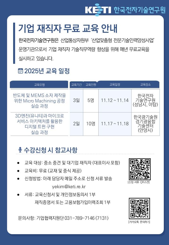 한국전자기술연구원은 산업통상자원부 "산업맞춤형 전문기술인력양성사업" 운영기관으로서 소재부품장비분야 기업 재직자분들의 기술직무역량 향상을 위해 아래와 같이 매년 무료교육을 실시하고 있습니다.