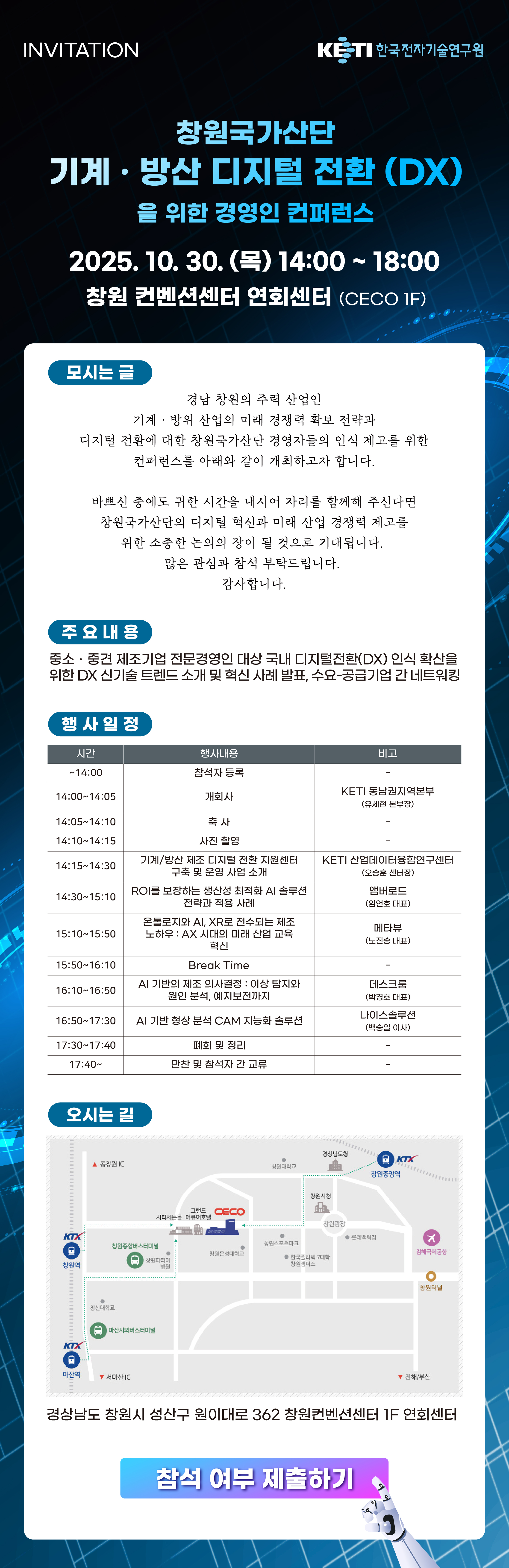 창원국가산단 내 경영자(CEO) 분들의 인식 제고를 위해 '기계·방산 디지털 전환(DX)을 위한 경영인 컨퍼런스'를 개최하고자 합니다.