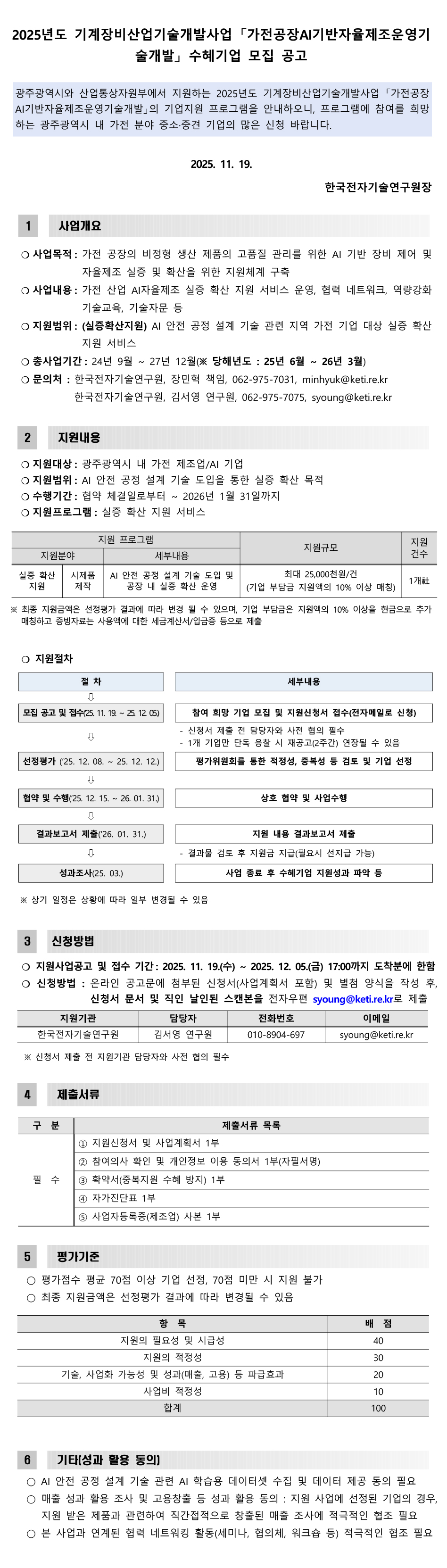 01. 2025년도 기계장비산업기술개발사업 수혜기업 모집 공고문.hwp (80.50 Kb / Down : 88) 02. 2025년도 기계장비산업기술개발사업 기업지원 사업신청서 양식.hwp (60.00 Kb / Down : 77)