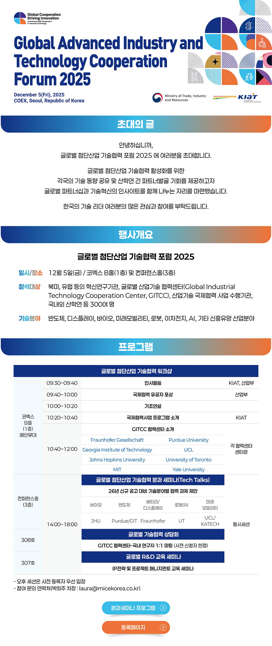 12월 5일(금) 개최 예정인 글로벌 첨단산업 기술협력 포럼을 아래와 같이 안내드립니다.