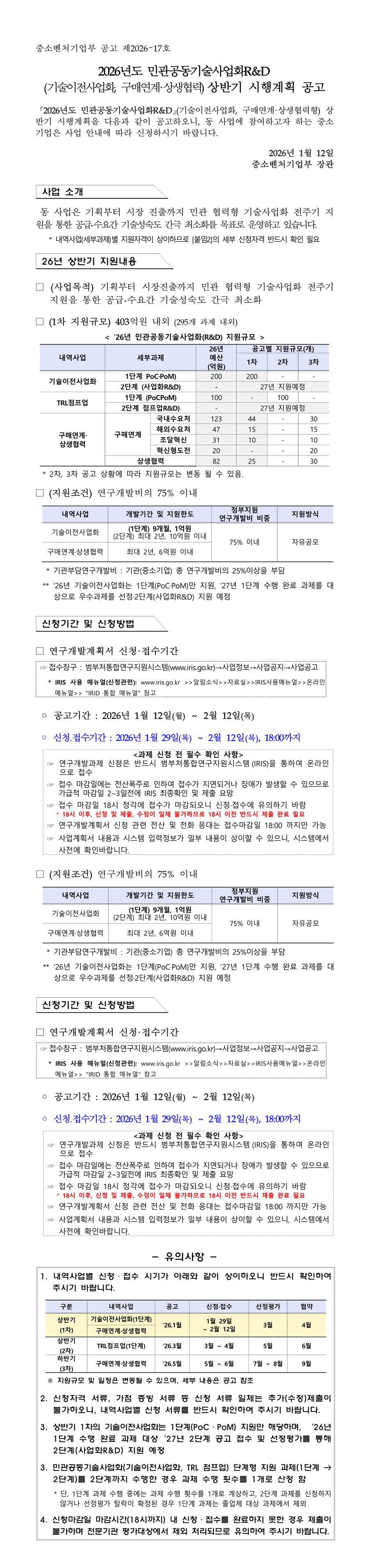 (공고 제2026-17호) 2026년도 민관공동기술사업화R&D 시행계획 공고.hwpx (122.75 Kb / Down : 155) [붙임2-1] 기술이전사업화 세부지원 내용.hwp (122.00 Kb / Down : 139) [참고] 자주 묻는 질문(FAQ)_기술이전사업화.pdf (294.01 Kb / Down : 147) 붙임 1-1_1-2.zip (141.99 Kb / Down : 113) 붙임3. 기술이전사업화 제출 서류 양식.zip (311.53 Kb / Down : 146)