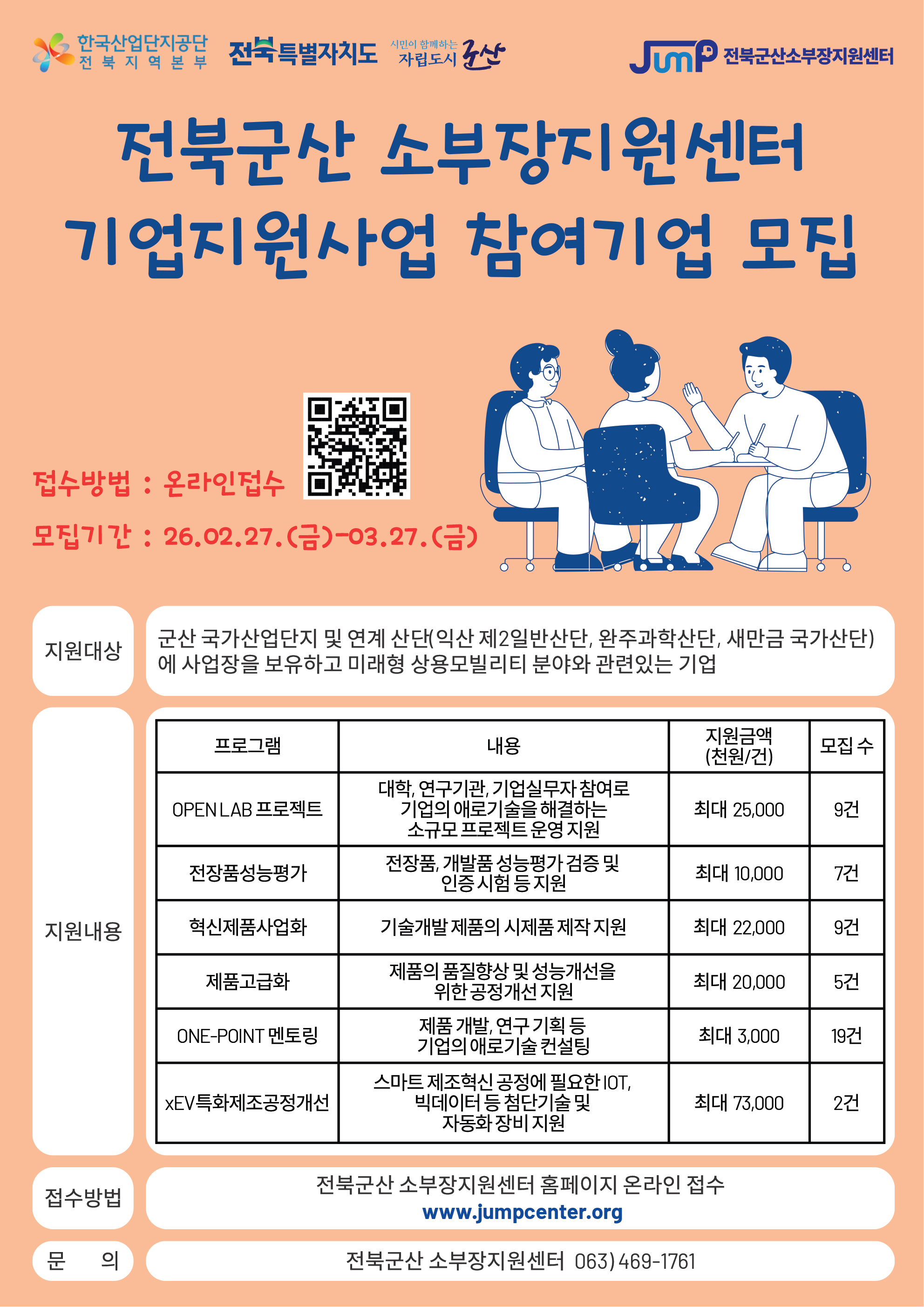 - 소부장지원센터 홈페이지 접수 : www.jumpcenter.org
