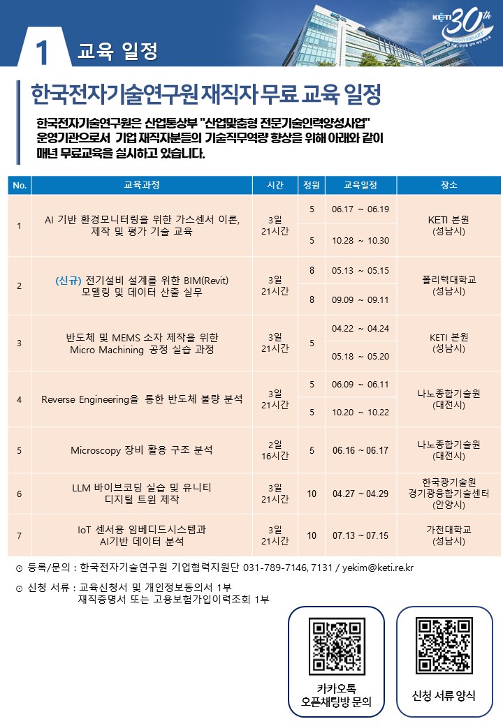 한국전자기술연구원은 산업통상부 "산업맞춤형 전문기술인력양성사업" 운영기관으로서 기업 재직자분들의 기술직무역량 향상을 위해 아래와 같이 매년 무료교육을 실시하고 있습니다.