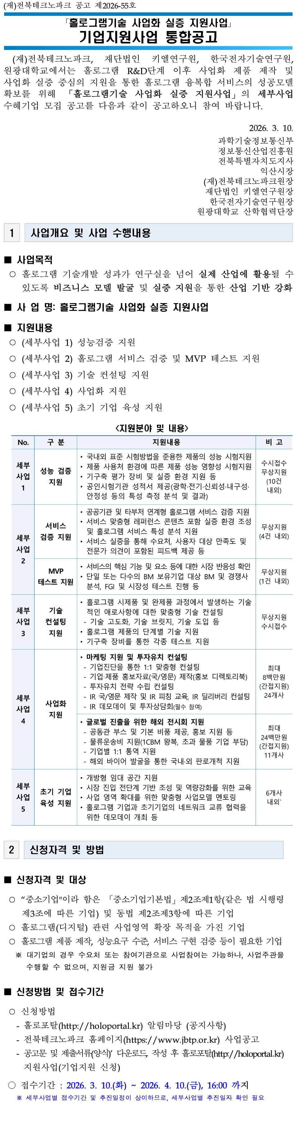 [붙임1] 홀로그램기술사업화실증지원사업 통합공고문_최종.pdf (430.33 Kb / Down : 47) 통합공고_양식.zip (821.42 Kb / Down : 45)