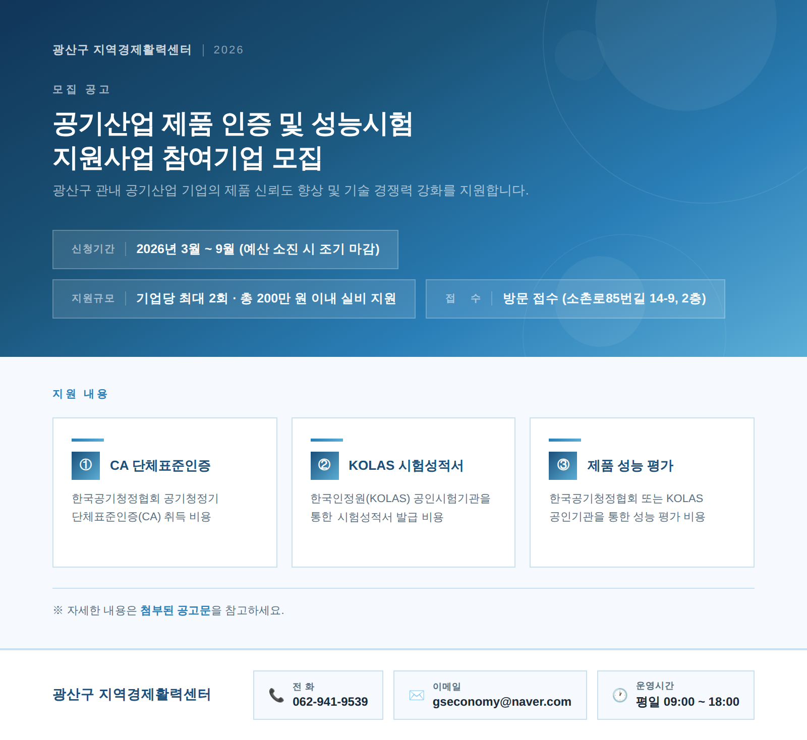 광주광역시 광산구 소재 기업에 대한 공기산업 제품 인증 및 성능시험 지원사업에 대한 소개자료, 포스터를 게시합니다.자세한 사항은 첨부파일의 공고문을 확인해주세요.많은 참여부탁드립니다