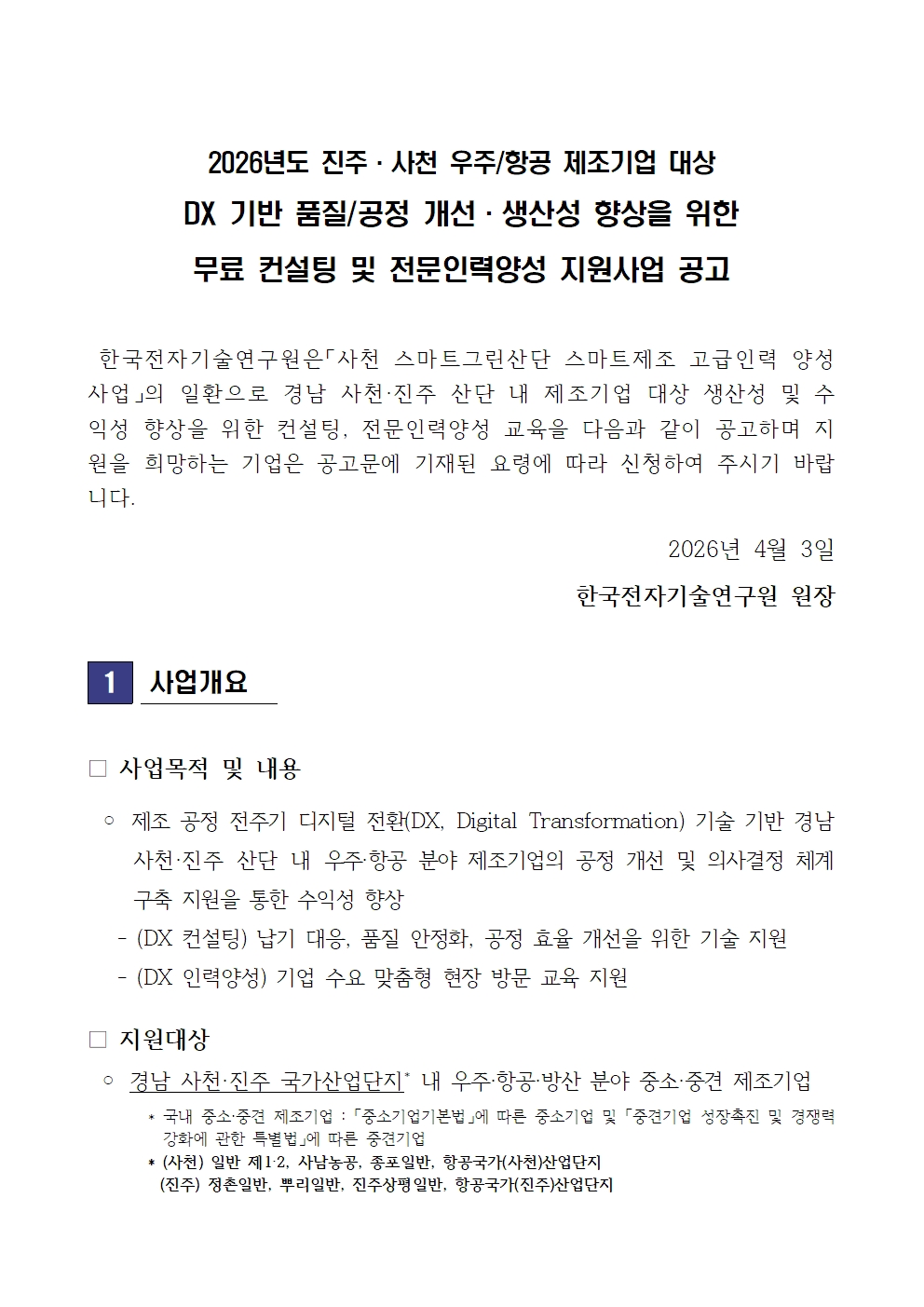 2026년도 진주사천 우주항공 제조기업 대상 DX 기반 품질공정 개선 및 생산성 향상을 위한 무료 컨설팅 및 전문인력양성 지원사업 공고.pdf (365.10 Kb / Down : 9) 붙임1. 지원사업_신청양식_KETI.hwp (98.00 Kb / Down : 8)